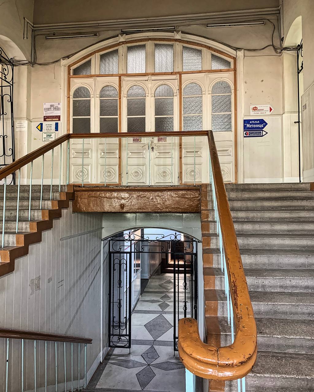 Смотрю, три арки на входе, две из которых забиты дверьми, лепнина, выкрашенная золотистой краской. Заглянула на лестницу, ведущую на второй этаж (раньше мимо пробегала), а там такая красотища! И охранник.